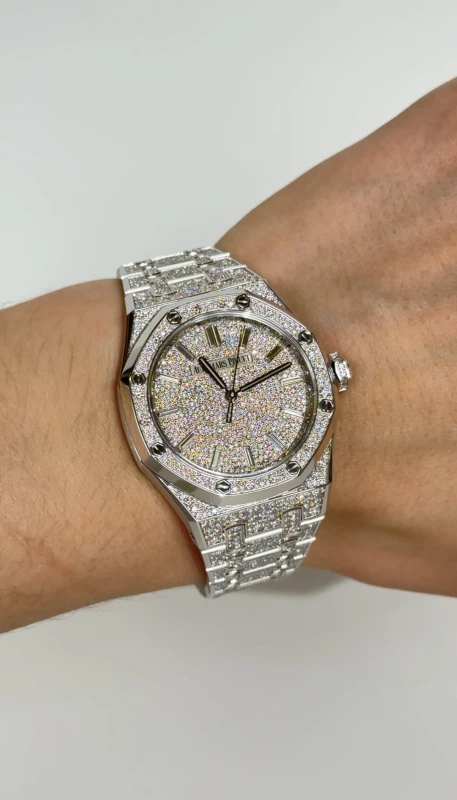 часы инкрустированы природными бриллиантами : 318 бриллиантов блестящей огранки; ~1,905 карата (в случае). 699 бриллиантов блестящей огранки; ~1,40 карата, 13 бриллиантов багетной огранки; ~0,32 карата (циребра). 1106 бриллиантов блестящей огранки; ~3,875 карата (браслет).