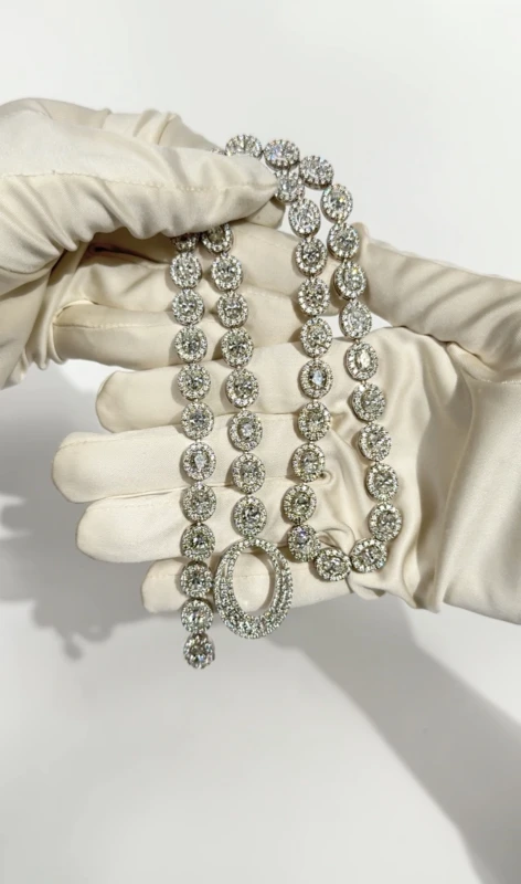 Колье выполнено из белого золота 750 пробы. 64 Бриллианта огранки Овал общей массой 32.13 кар. E-F-G-H/VVS-VS (Сертификат GIA на каждый Бриллиант)  988 Бриллиантов Круглой огранки общей массой 17.58 кар.